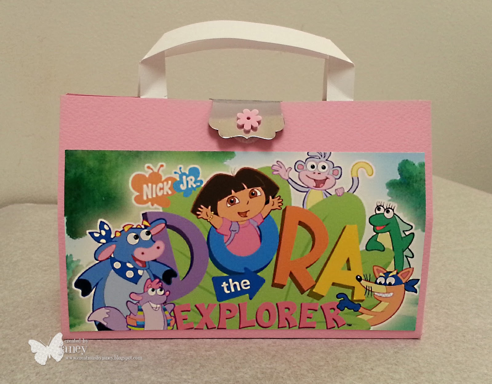 Aloha! Today I would like to share some Dora the Explorer goody bags I created using a 12 x 12 sheet of scrapbook paper. I just love how cute these turned out. I found the Dora picture online, printed it, glued it to the front of the bag and used stampin up's label punch for the closure that is being held down with a velcro dot.